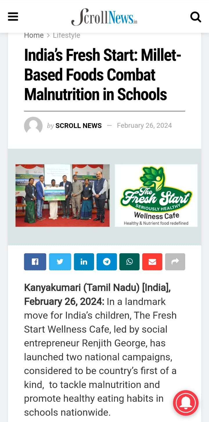 Fresh Start Wellness Cafe has initiated a groundbreaking malnutrition eradication drive in schools across India. The initiative aims to provide millet-based nutritious meals to students, promoting better health and tackling the nation’s pressing malnutrition crisis