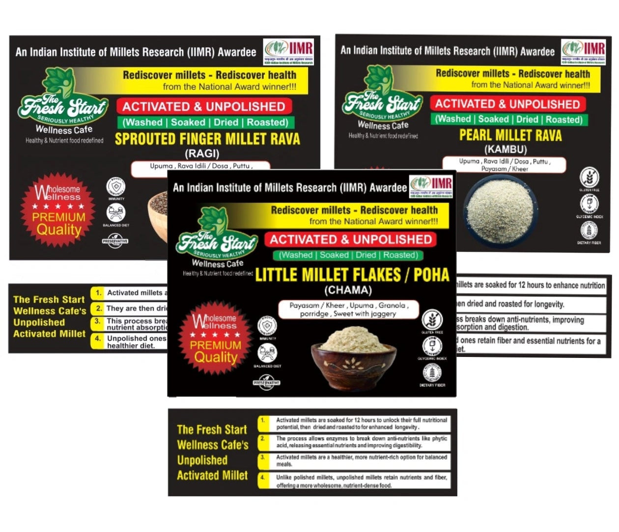Sprouted Finger Millet (Ragi) Rava, Little Millet (Samai) Flakes & Sprouted Pearl Millet (Bajra) Rava
